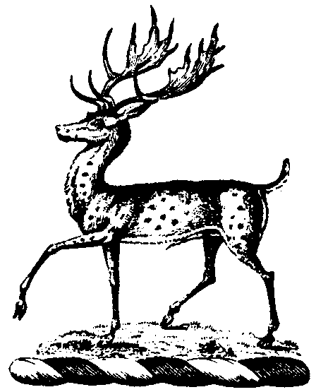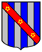"Paly of six, argent and azure, on a bend gules, three cinquefoils or."
